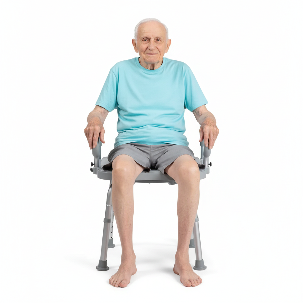 This compact and customizable swivel bath chair is designed to assist individuals with limited mobility in safely entering and exiting the tub. The 360° swivel seat locks at every 90°, reducing friction-related injuries and providing greater comfort. Height adjustable from 15" to 22", the chair also features padded armrests that pivot up for easier access and lock down for added support.