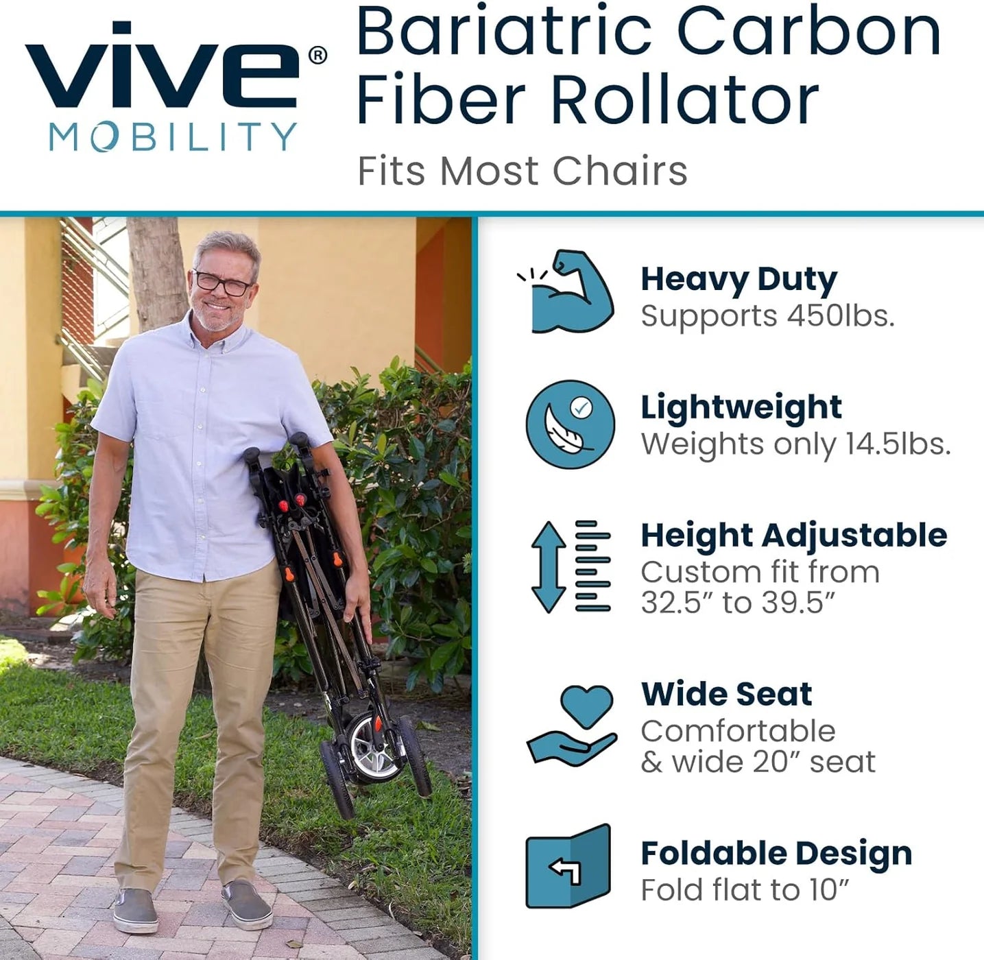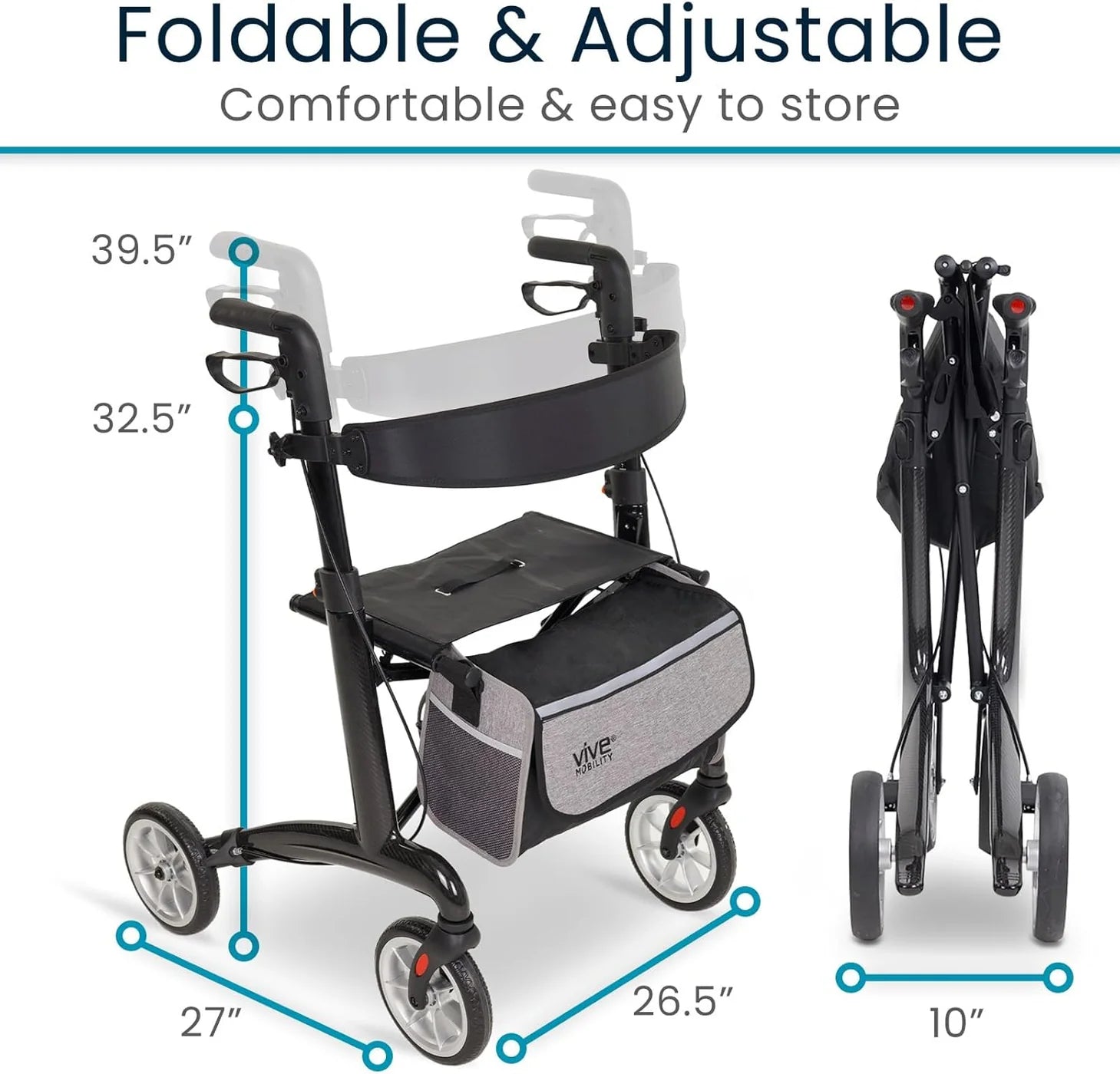 Built for strength and convenience, this carbon fiber rollator combines a lightweight frame with heavy-duty support, safely holding up to 450 lbs. The foldable design makes it easy to transport or store, while the spacious 20” wide seat ensures superior comfort. With ergonomic handles that adjust from 32.5” to 39.5” and 8” wheels for smooth maneuverability, it delivers both portability and stability. A durable storage bag is included, making this rollator an all-in-one solution for reliable mobility support.