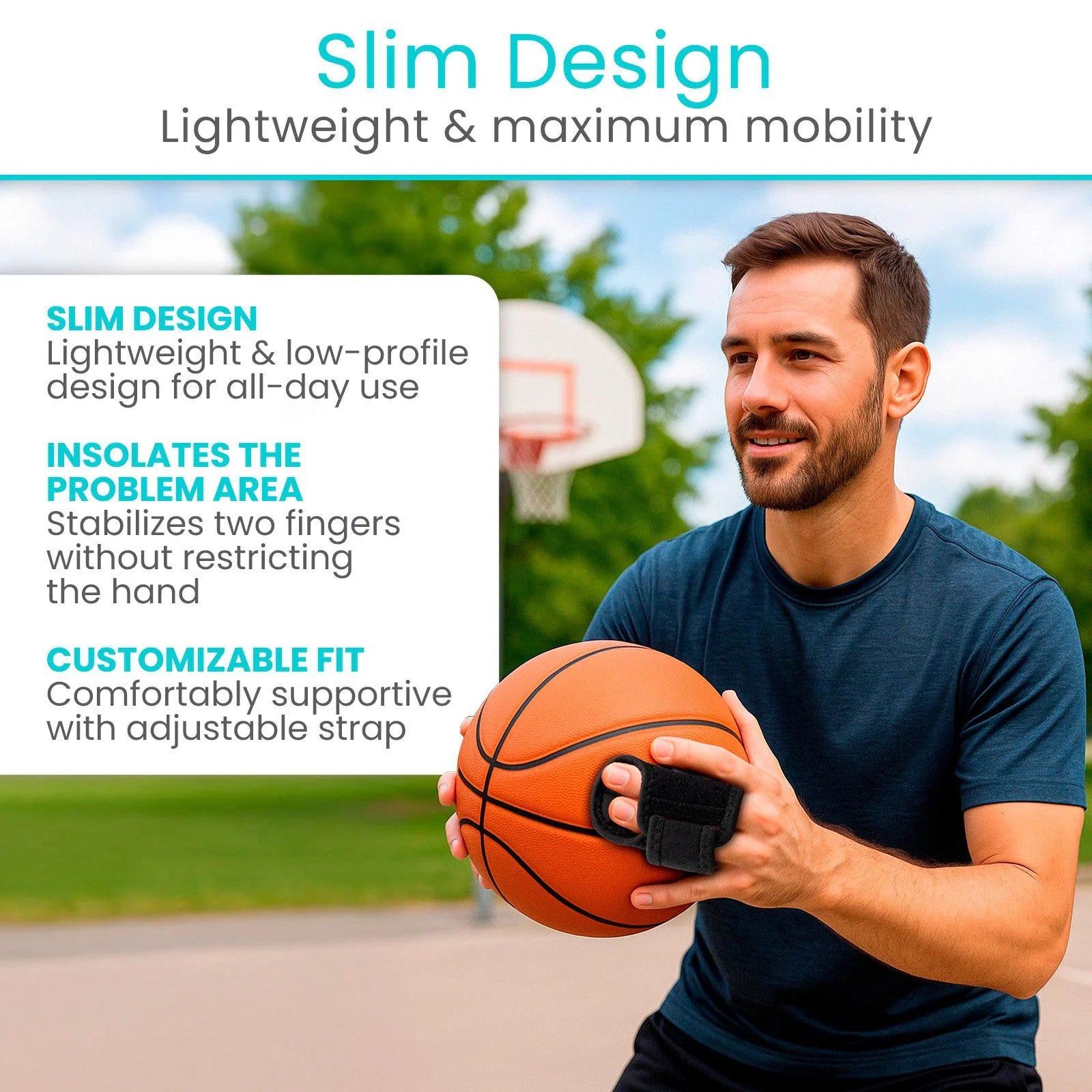 The Dual Finger Splint is designed to provide reliable support, full protection, and double compression to help prevent sprains and injuries. Its adjustable fit makes it suitable for any finger on either hand, offering stability without restricting movement. Made with breathable, lightweight materials, this splint is comfortable enough for all-day wear. The secure D-ring design keeps it firmly in place, making it ideal for sports, daily activities, or recovery from finger injuries.