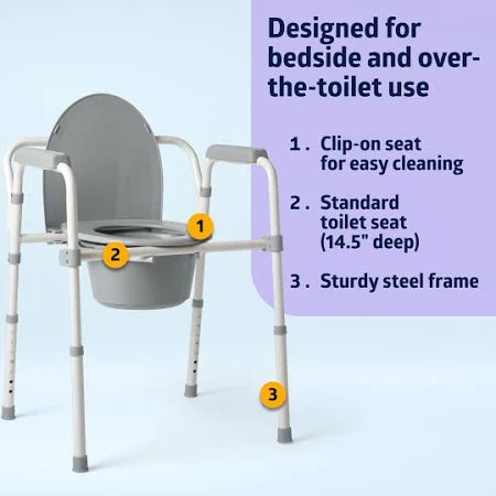 Designed for versatility, comfort, and convenience, this multi-use unit functions as both a raised toilet seat and a portable commode, making it ideal for individuals with limited mobility, post-surgery recovery, or in-home care. It includes a 7-quart commode bucket with a carry handle, cover, and splash shield, ensuring hygienic use and easy cleaning.