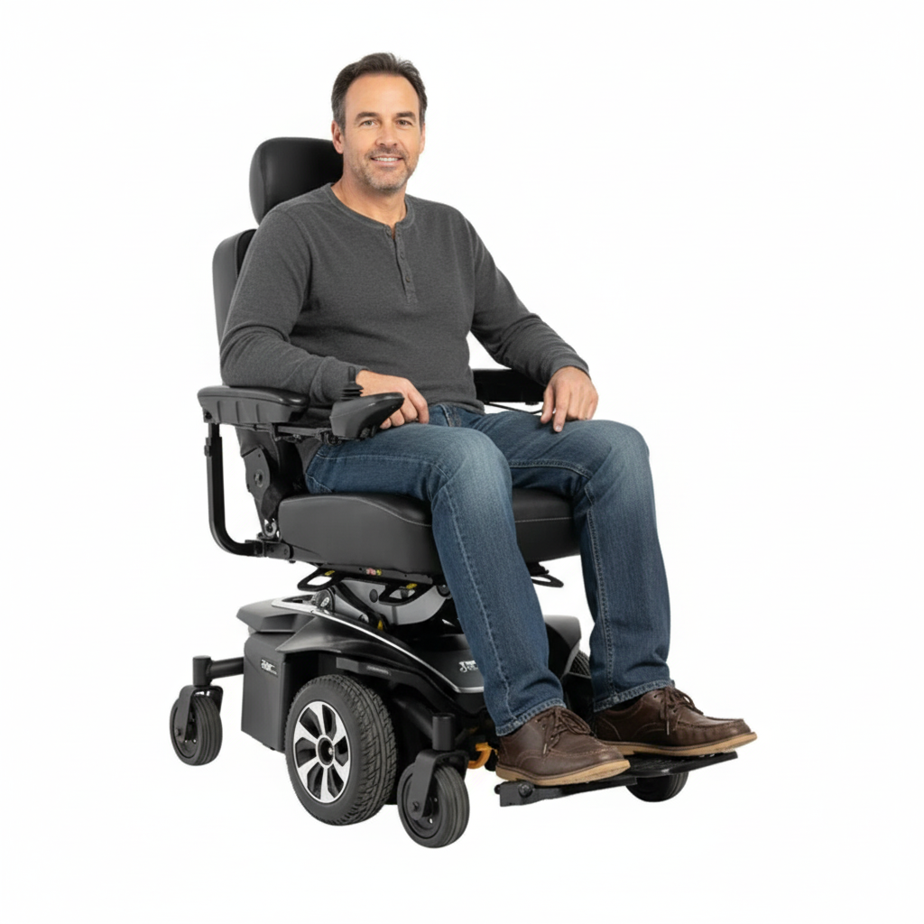 The Jazzy Air® MED is the next generation of power seat elevation, offering 12 inches of smooth, power-adjustable seat height to help you reach, interact, and move with greater independence. Designed for both comfort and performance, it maintains a top speed of 3.71 mph whether elevated or not, with a tight 24.4” turning radius for easy maneuvering. The Active-Trac® Suspension with Mid-Wheel 6® technology delivers maximum stability across different environments, while its 300 lbs. weight capacity and battery range of up to 14.1 miles (at 220 lbs.) or 13 miles (at 300 lbs.) ensure reliability all day long. With non-scuffing, flat-free tires and a sleek design, the Jazzy Air® MED takes your mobility experience to the next level.