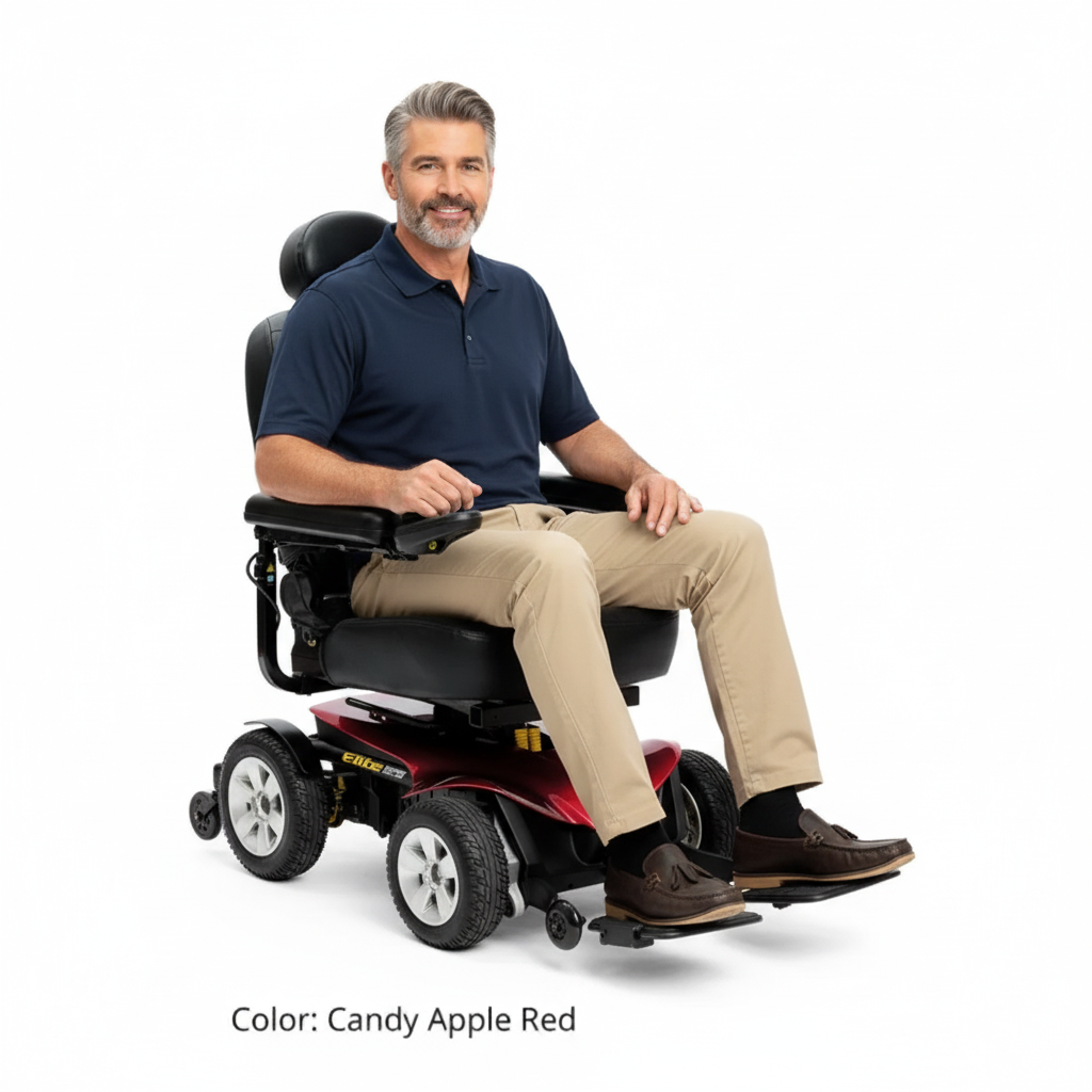 The Jazzy® Elite ES combines power, comfort, and exceptional maneuverability to deliver a smooth and reliable mobility experience. With a 300 lbs. weight capacity and speeds of up to 4 mph, it offers dependable performance both indoors and outdoors. Its compact 24.75" turning radius and in-line, front-wheel drive technology make navigating tight corners and small spaces effortless, while large front wheels provide excellent shock absorption over obstacles. The comfortable, depth-adjustable high-back seat with headrest and limited recline ensures all-day support, and the up to 13.5-mile range per charge keeps you moving longer. Finished in stylish Candy Apple Red and built for durability, the Jazzy® Elite ES is a perfect balance of performance and comfort.