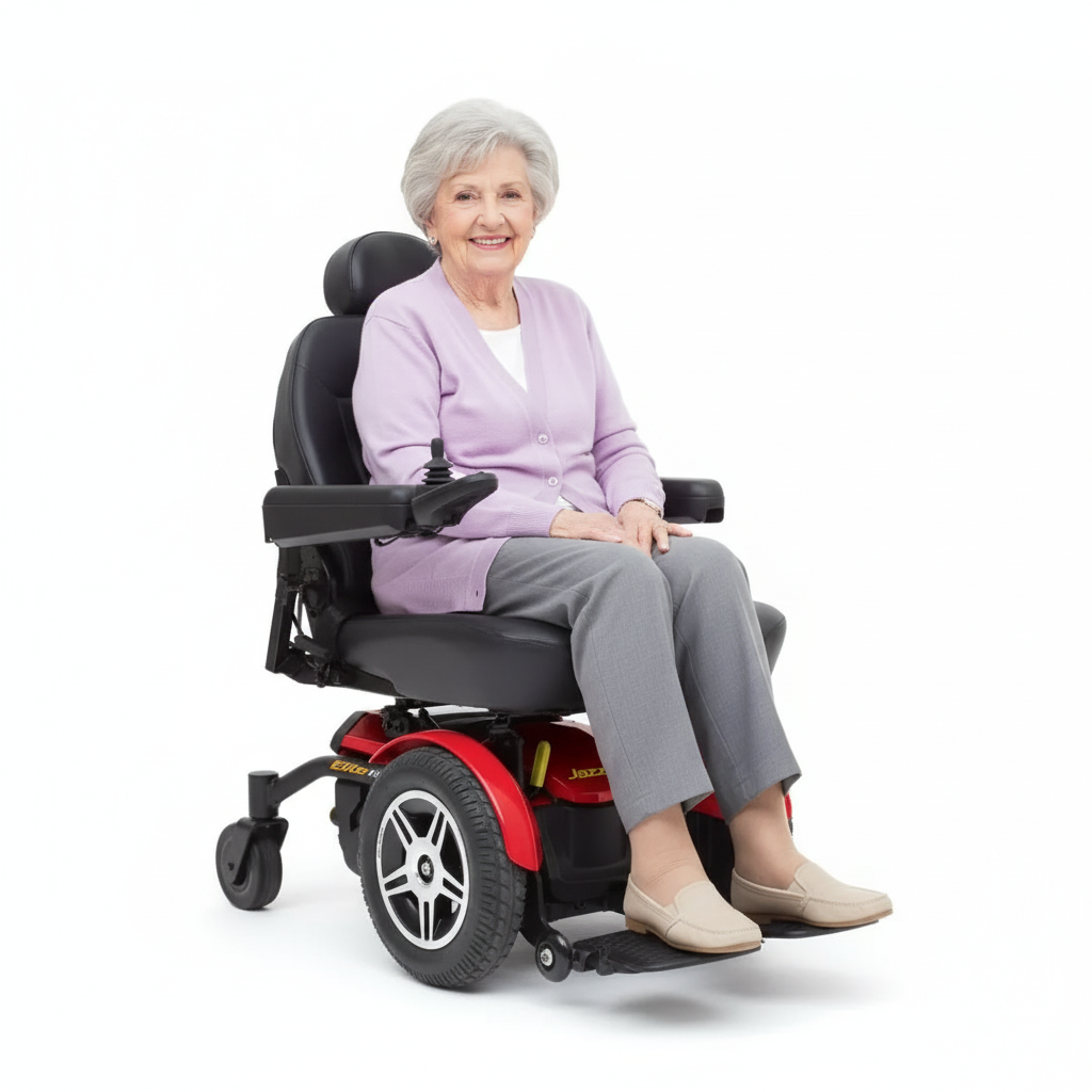 The Pride Jazzy Elite HD is a heavy-duty power chair designed for durability, comfort, and performance. Featuring bold red or blue shrouds that protect against nicks and scratches, this power chair is built to handle both indoor and outdoor use with its 14" flat-free drive wheels and front-wheel drive system for stability across most terrains. It supports multiple seating options, including reclining back, high-back, and captain’s seat, with widths ranging from 18″ to 22″ to fit user comfort. With a top speed of 4 mph, a drive range of up to 9.8 miles per charge, and a weight capacity supported by a strong frame, the Jazzy Elite HD offers reliable mobility. Practical features like height-adjustable flip-back armrests, versatile legrest options, and off-board battery charging make it user-friendly, while its compact 24" turning radius ensures easy maneuverability. Designed as a dependable mobility solution, it combines strength, comfort, and convenience for everyday use.