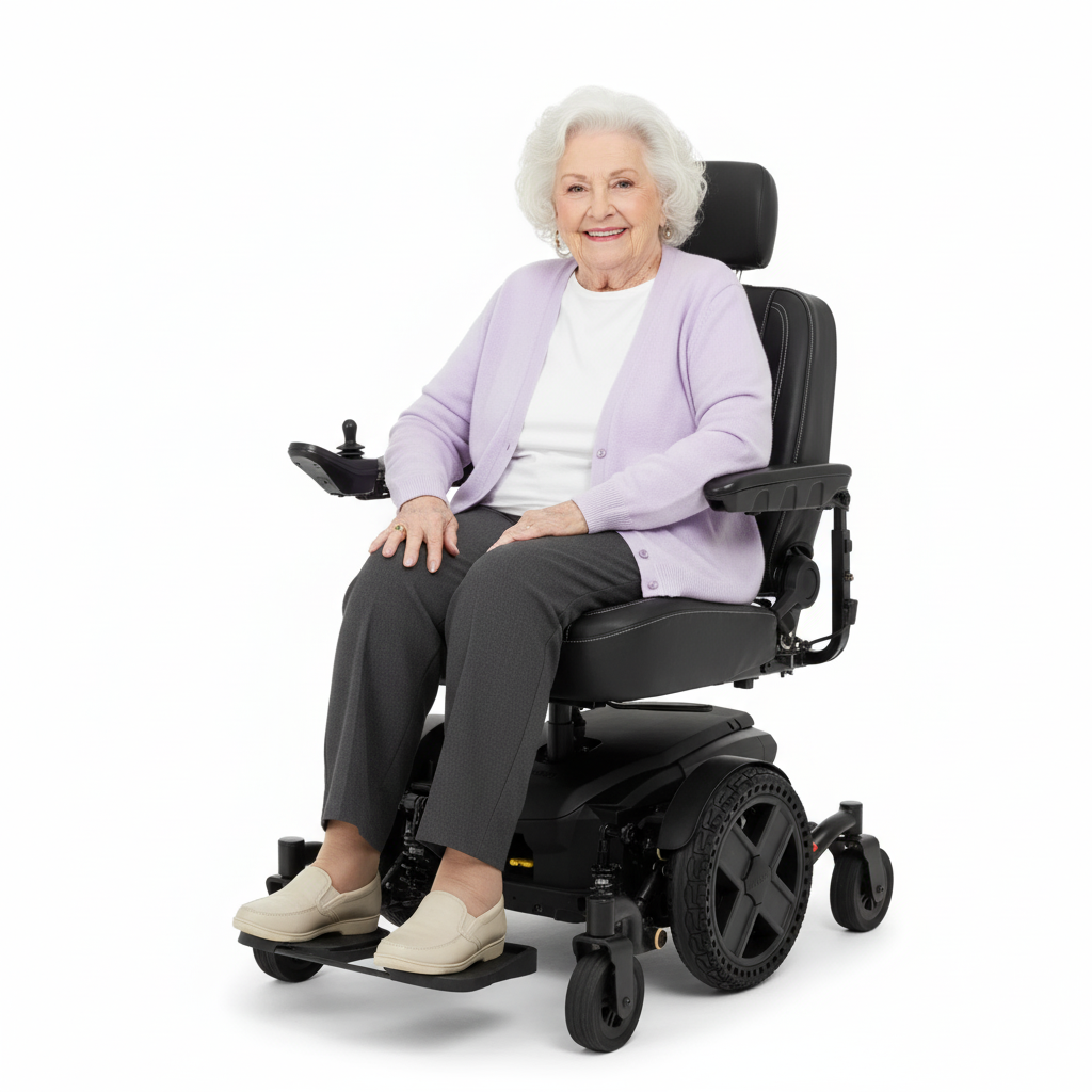 The Pride Jazzy® EVO 614 Power Wheelchair features perforated tires for a softer ride over varied terrain and for enhanced performance it is equipped with the Active-Trac® ATX Suspension. It has a powerful motor and a sturdy frame with a heavy duty seat post that swivels for ease of transferring out of the chair. The chair weight capacity of 300 lbs, or upgrade to the HD for 450 lbs and has an option of a Captain Seat or a Solid Seat pan to choose a cushion of your liking. For your comfort the armrests are height, width, depth and angle adjustable. While the seat width is available up to 22" in width.
