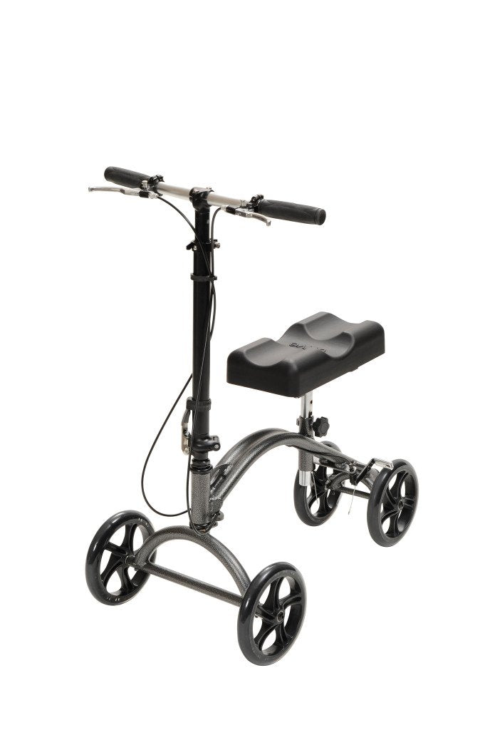 This Knee Platform Walker is a great way to get around and keep weight off your foot or ankle after surgery or injury. Even works well for patients with a cast or ankle brace. It uses front wheel steering and there is a handbrake on the handlebars.