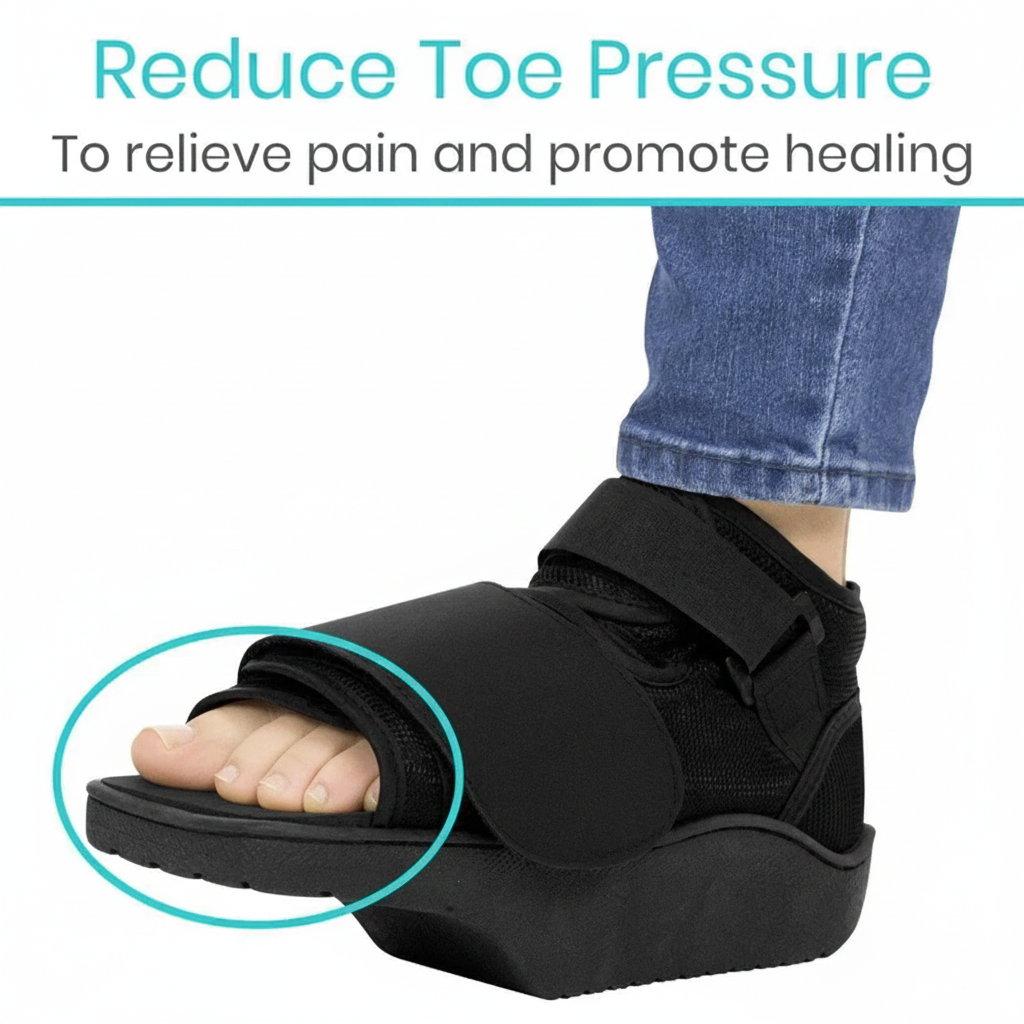 This is an offloading post-op shoe designed to protect and support the foot after surgery or injury. It helps relieve pressure on the toes and forefoot by shifting weight to the heel, making it ideal for conditions like broken toes, bunion surgery, or hammertoe correction. The shoe features a wedge design, wide square toe box for added protection, adjustable straps to fit over bandages or swelling, and a lightweight nonskid base for safe walking. It can be worn on either foot and is suitable for both men and women.