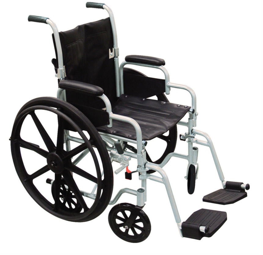 This versatile hybrid wheelchair easily converts from a self-propelled chair to a transport chair with quick-release 24" wheels. Built with a lightweight all-aluminum frame, it features fold-down backrest, durable nylon upholstery, and swing-away footrests with heel loops. Dual wheel locks provide safety in both configurations, while 8" casters and anti-tippers ensure smooth mobility and stability. Supports up to 250 lbs and is compatible with optional swing-away elevated leg rests for added comfort.