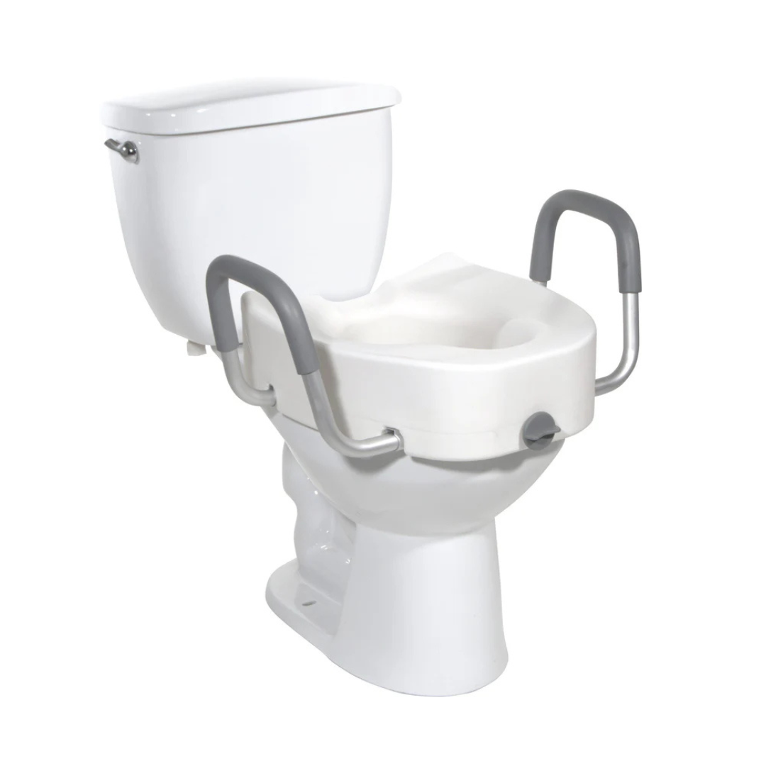 This Raised Toilet Seat with Removable Arms is designed to assist individuals who experience difficulty sitting or standing from the toilet. By adding 5 inches of height to the toilet seat, it reduces the strain on knees and joints, making bathroom use safer and more comfortable. The arms, spaced 21 inches apart, provide additional support and can be easily removed without tools if not needed. Its wide front and back openings allow for easier personal hygiene access. Made from heavy-duty molded plastic, this seat offers long-lasting durability while remaining lightweight and portable. The standard locking mechanism keeps the seat securely in place, and it fits most elongated toilets without requiring any tools for installation. Easy to clean and quick to set up, this seat is an excellent addition for seniors, people with mobility issues, or those recovering from surgery.