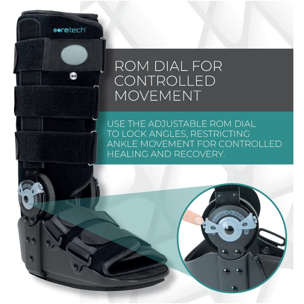 The Tall ROM Walking Boot provides advanced support and stability for effective recovery from foot and ankle injuries. Featuring multiple adjustable fastener straps, the boot ensures a secure, personalized fit, while the padded liner with dual foam inserts offers superior cushioning and comfort. Non-slip rocker soles promote a natural gait and reliable traction without leaving marks, enhancing mobility during recovery. The adjustable Range of Motion (ROM) dial allows precise angle locking to restrict specific ankle movements, providing controlled support to aid healing. Designed for both comfort and functionality, this walking boot combines stability, protection, and flexibility for a safe and efficient recovery journey.