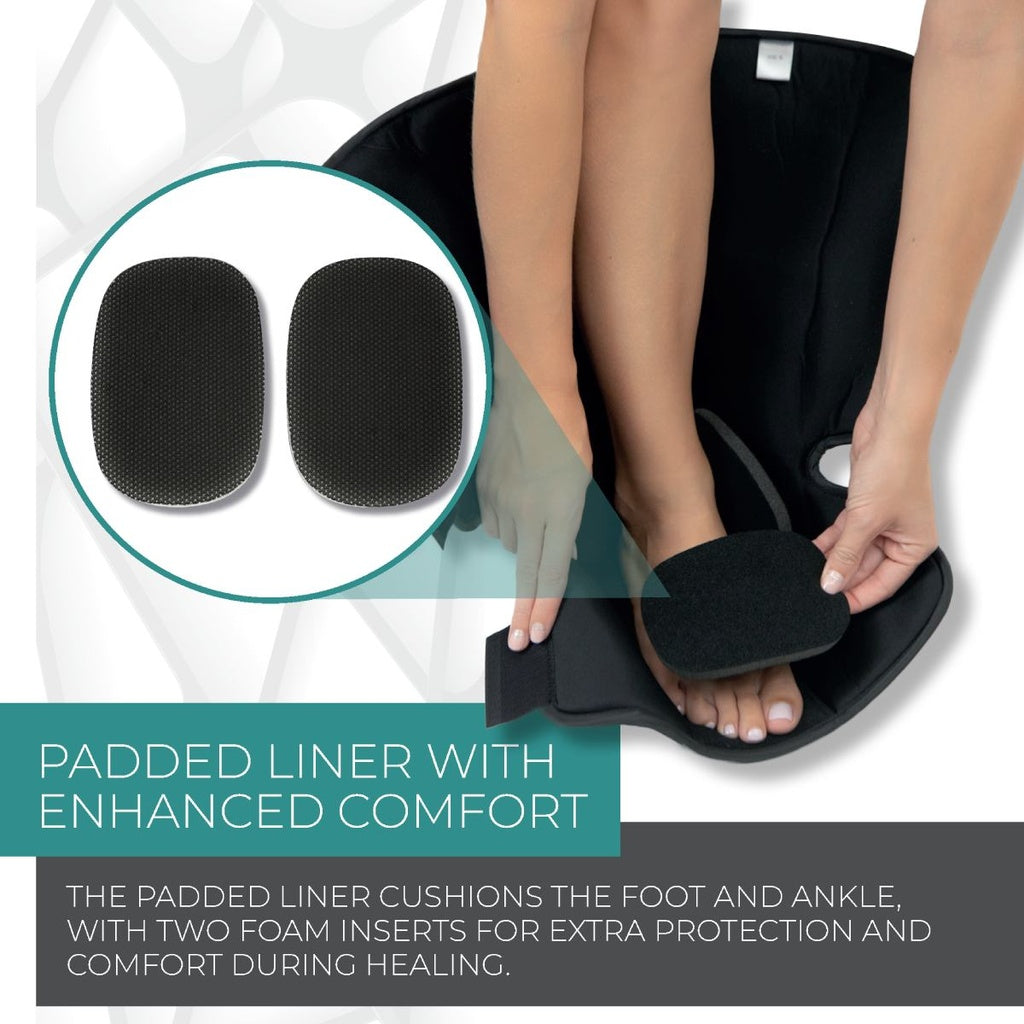 | Features | Adjustable fastener straps, padded liner with foam inserts, non-slip rocker soles, ROM dial for controlled ankle movement |